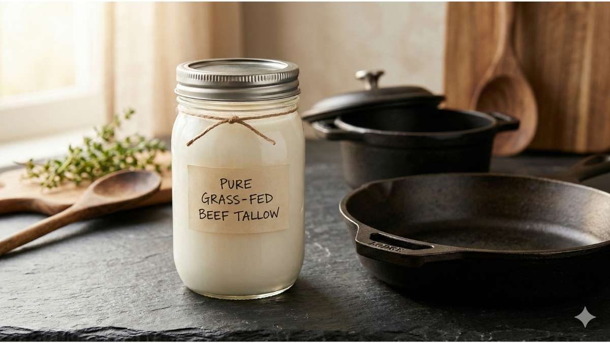 Tallow is rendered suet (kidney fat). 100% grass-fed beef tallow is essential for high-heat cooking because of its thermal stability.